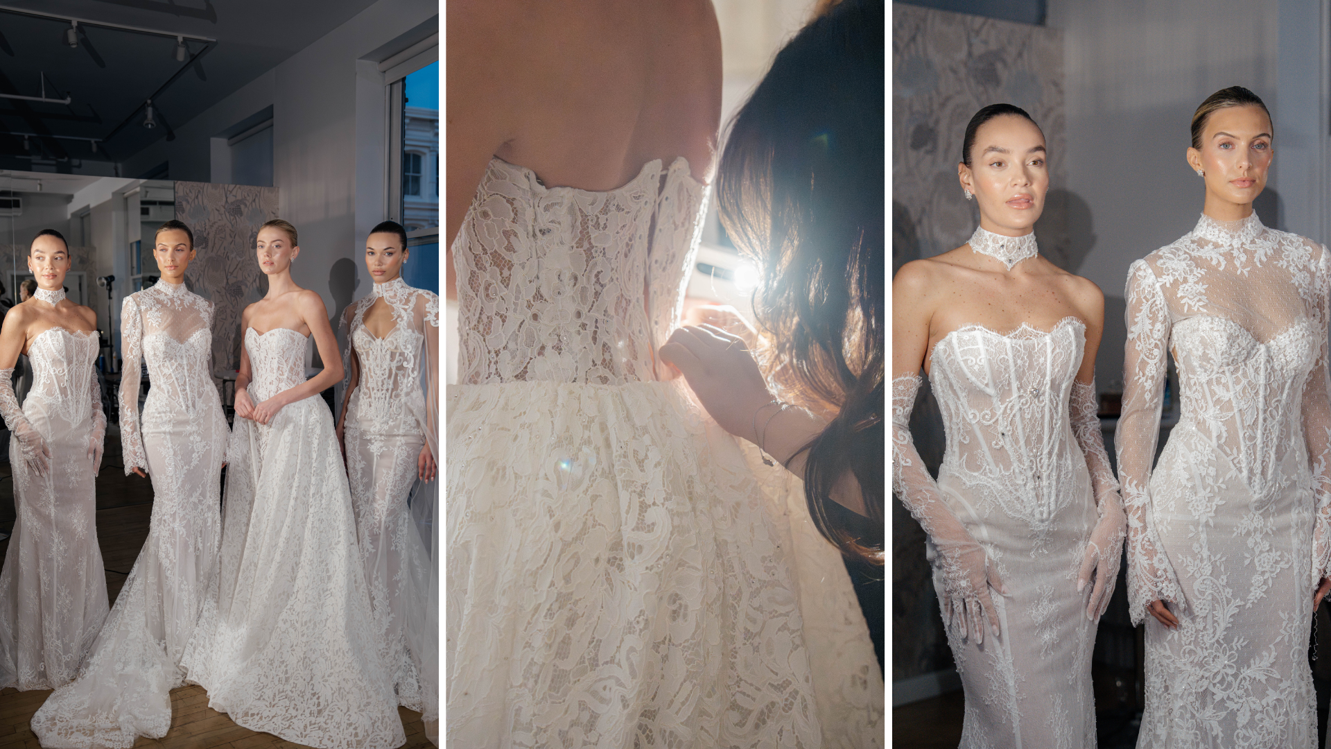 Corsetry anchored many of the looks, defining the waist before releasing into lace or layered skirts. Illusion panels framed the body with careful placement, while hand-applied embellishments caught the light without disrupting the structure beneath.