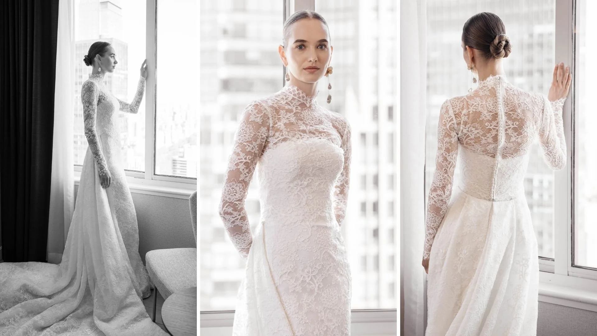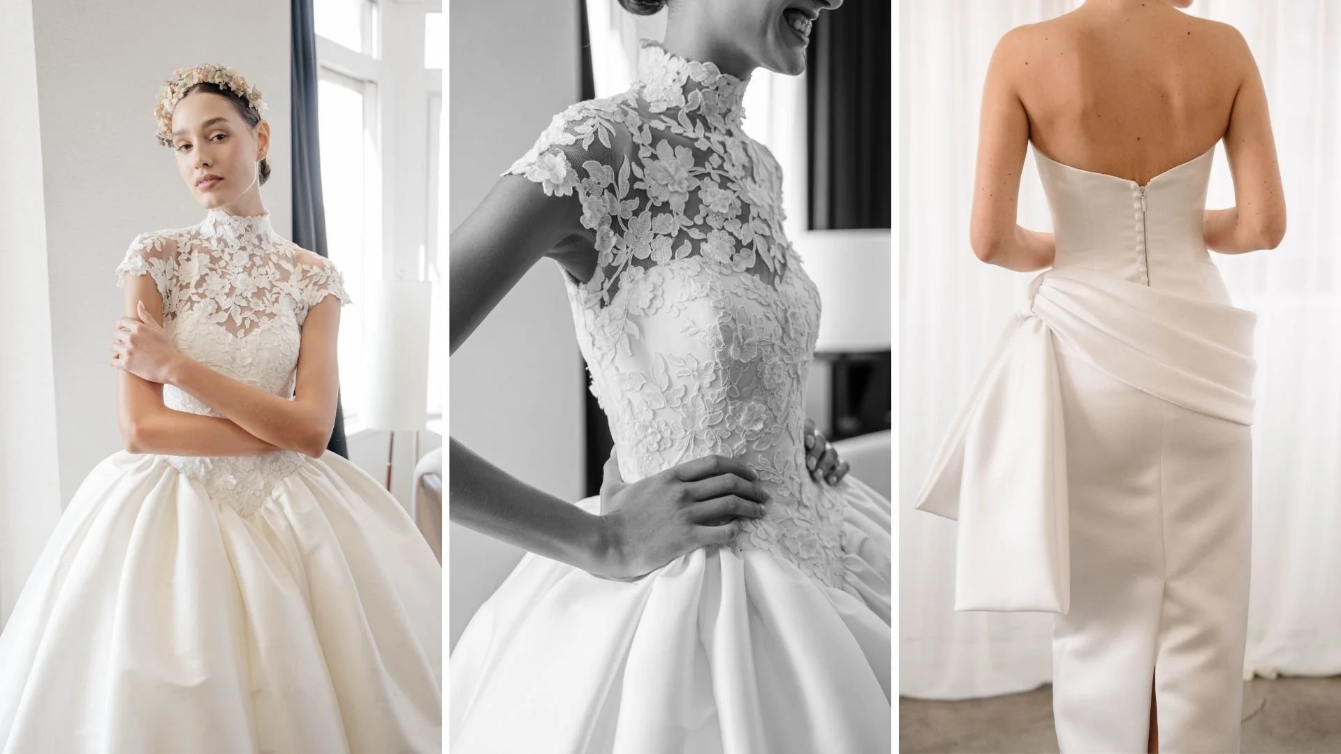 That ethos is evident in the construction. High-neck lace bodices, often extending into long sleeves or sculpted halter variations, create a sense of poise through coverage. These are not conservative for the sake of it; they’re deliberate, framing the body with clarity while allowing texture to carry the visual weight.