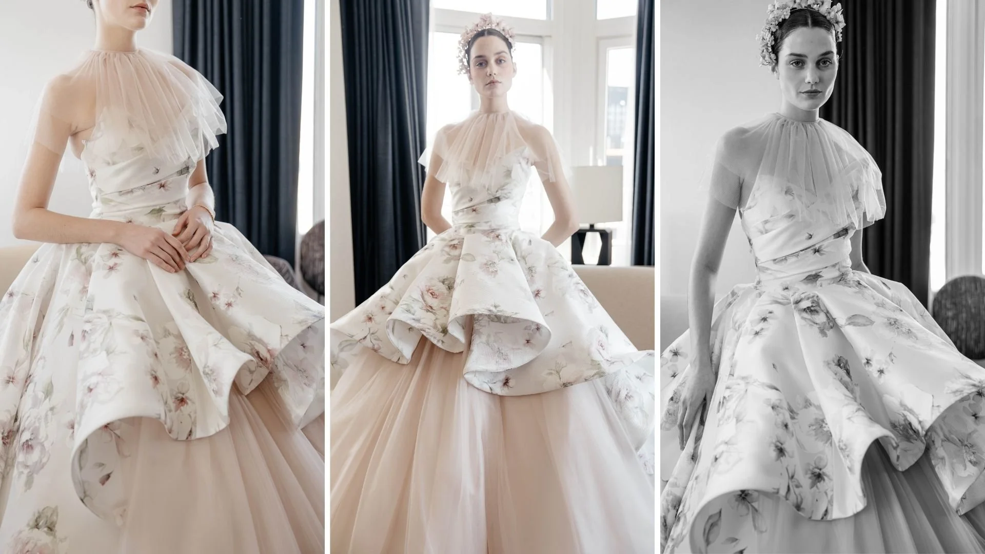 There are moments of interruption—subtle, but effective. A sculptural peplum-like overskirt in floral jacquard shifts proportion at the waist, adding dimension without overwhelming the frame. Off-the-shoulder satin bodices soften the neckline while maintaining structure through internal corsetry. Even the back details, covered buttons, gentle bows—are resolved with care, never drifting into ornament for ornament’s sake.