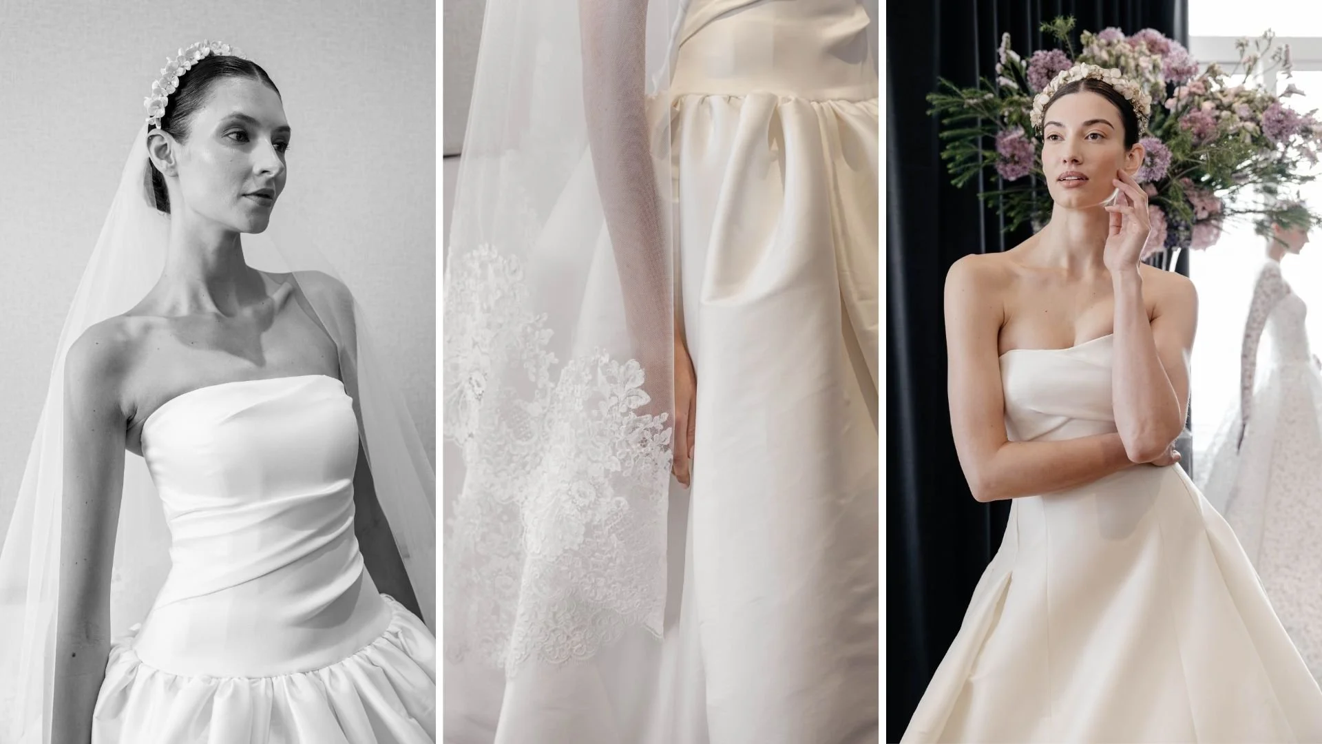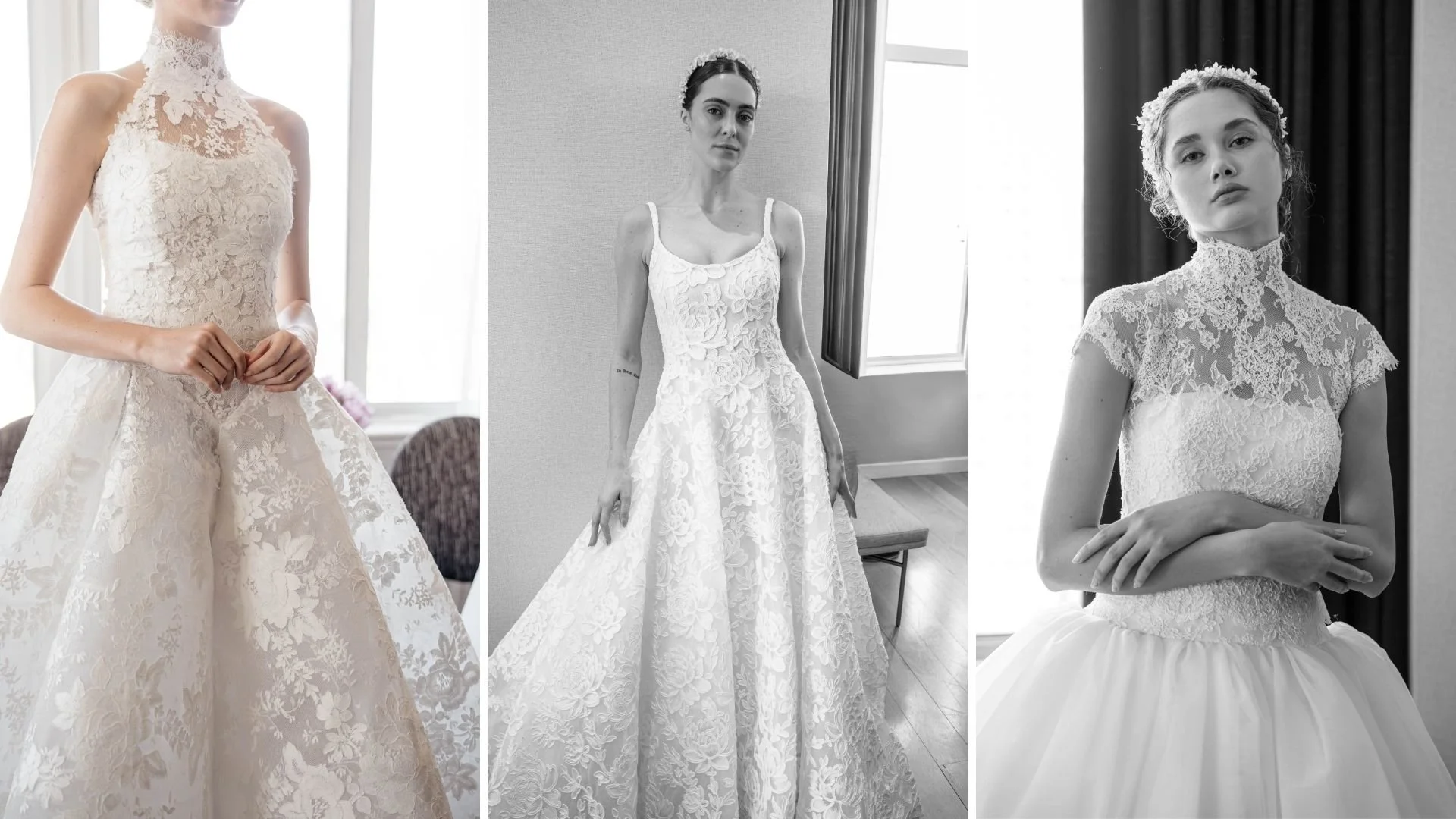 Silhouettes move between two poles. On one end, slim, elongated columns emphasize verticality—clean, uninterrupted lines that allow the lacework to read in full. On the other hand, structured ballgowns introduce volume through precise skirt engineering rather than excess layering. Pleated satin underskirts provide shape, while lace overlays maintain cohesion with the rest of the collection.